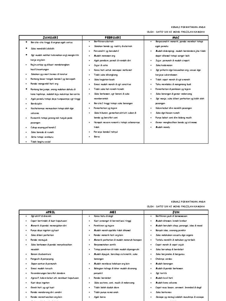 Contoh tarikh lahir Lia ialah 761992. Kepakaran anda hanyalah menuding jari pada sesuatu benda. 9 Februari hingga 18 Februari Hijau.
